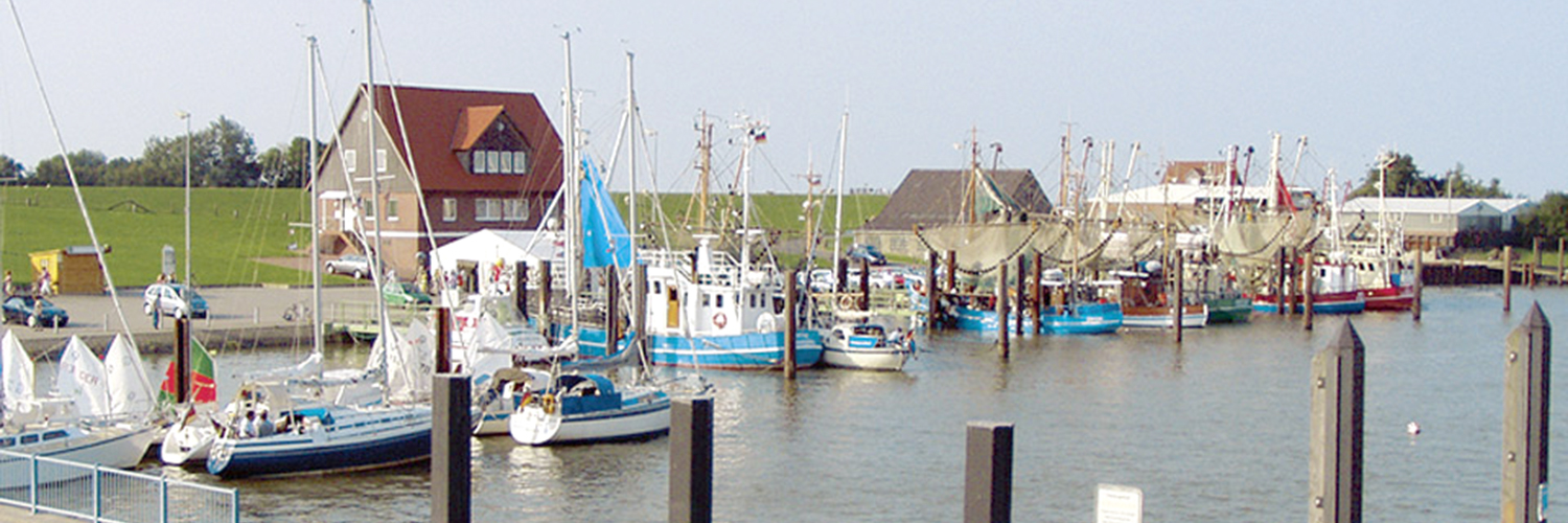 Krabbenkutter Hafen Fedderwardersiel mit Museum Nationalparkhaus: Krabben, Fisch, Räucherfisch und Matjes, hier ist alles frisch.