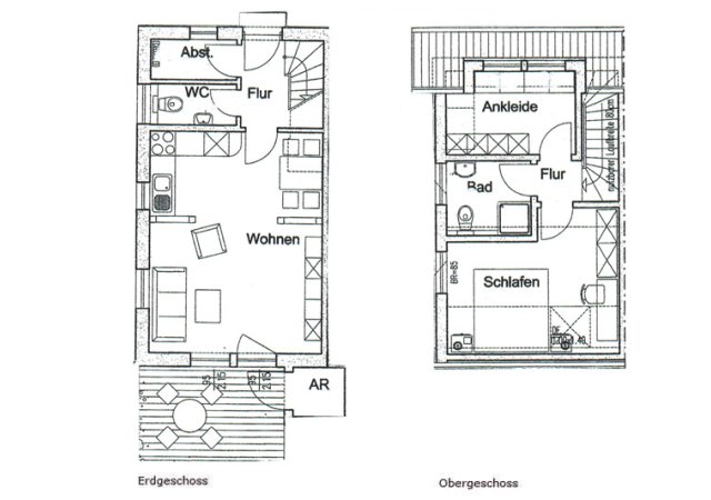 OG: 1 Schlafraum mit Doppelbett, 1 Schlafraum mit Einzelbett und weitere Schlafmöglichkeit, Bad mit Dusche und WC, Sonnenterrasse, Abstellraum und Parkplatz am Haus