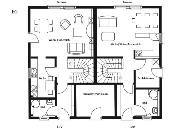 EG: Wohn-Essbereich, separate Küche, Bad mit Dusche und WC, Flur, Terrasse