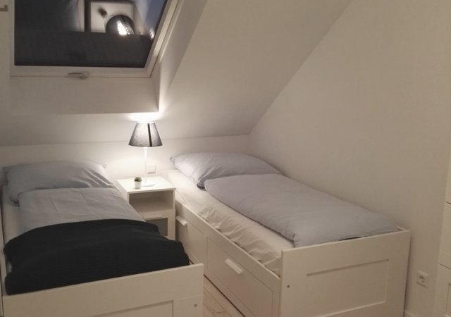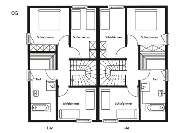 OG: ein Schlafzimmer mit Doppelbett, zwei Schlafzimmer mit zwei (jeweils ausziehbaren) Einzelbetten, Bad mit Sauna, Badewanne, Dusche und WC