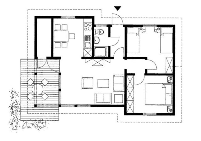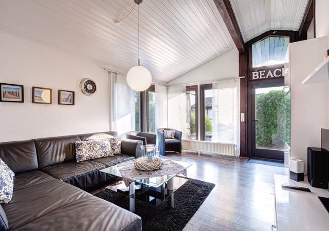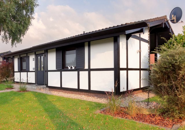 Freistehender Ferienbungalow im Fachwerkstil, ca. 65 qm, für max. 5 Personen, Wohnraum mit angeschlossener Küche, Essecke, Bad mit Dusche und WC, 1 Schlafraum mit Doppelbett, im 2. Schlafraum 3 Schlafmöglichkeiten, davon 1 Hochbett, Sonnenterrasse, Abstellraum und Parkplatz am Haus